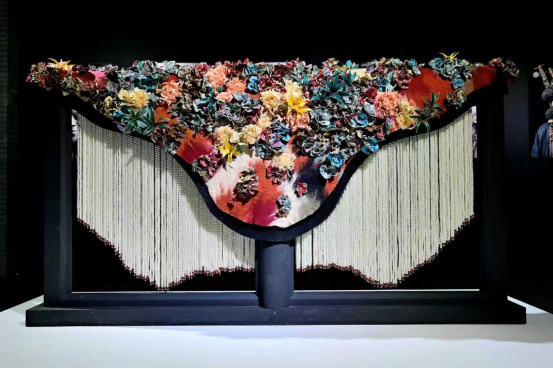 点的非遗材料:蜀锦,在云肩上制成繁花盛开的造型,呼应川剧戏曲服饰的华丽意象,同时象