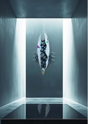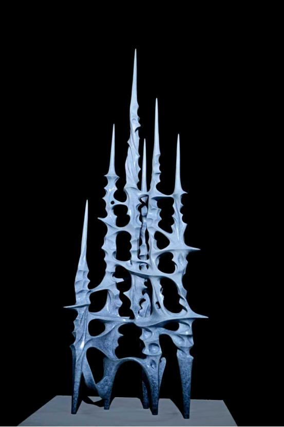 这件是一件极具未来感的原创雕塑。整件雕塑极具未来感与神秘生命体,线条流畅且张力十足,尖锐轮廓传递速度与力量。镂空孔洞打破沉闷,形成虚实对比,增添灵动通透感。