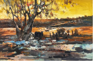 我于大学毕业后在阿坝州阿坝高等专科学校艺术系工作了八年,阿坝州给我留下了深厚的情结,每每想起岷江河畔那落日的晚霞,自然和谐,宁静悠远,苍劲有力的大树下远眺的牛,薄务升起在水面,这些画面时时浮现在我的脑海,因此创作了这幅牵动心情的画。