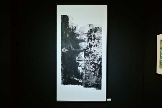 以现代水墨的标志性创作风格,在传统笔墨与当代艺术的维度间,抽象构成与具象意蕴的融合中,为大渡河的精神内核赋予全新水墨注解。浓墨如崩崖横天,淡墨似怒涛卷地,借大开大合的破墨技法,让墨色在渗化、碰撞中迸发强烈张力——抽象的块面结构营造出排山倒海的视觉冲击,具象的河谷意象又隐于黑白层次间,使大渡河的 “魂魄力量” 具象为水墨的狂放与凝练。墨色的淋漓泼洒与精密控制,在纸间交织成震撼人心的交响,直观感知大渡河的雄浑气魄与传奇质感。
