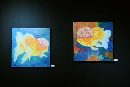 在这个系列中,之前绘画总体塑形的模式得以延续,所不同的是画面主题变成各类形态的金鱼形象。选择“金鱼”这类题材充满了危险的挑战,金鱼往往被形容为大俗大雅的人工观赏物种,也作为一种喜庆图案被广泛应用各类民间用品中。同样地,杨丙亮的画面处理仍然沿用了之前远看与近观的处理方式,然后在金鱼的头部加以超现实“微观盛景”的图像表现。同时这也延续着艺术家以动物来表达自己对生命关注的主题,所不同的是在“金鱼”系列中,艺术家更加喜欢让“金鱼”自身来诉说水中的温度,来告知我们世间的冷暖。