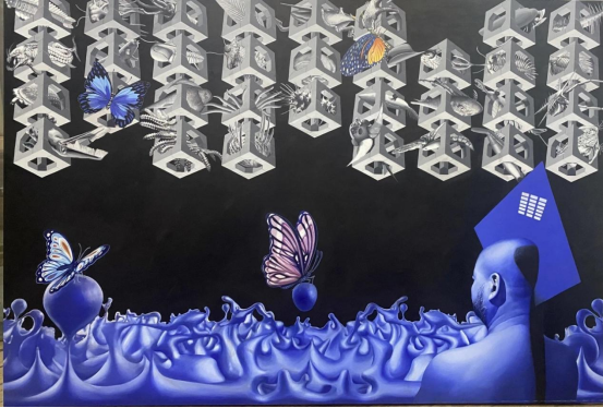 (苍鑫 《多维空间与次元系列的人工智能模型》 油画2021年 尺寸200*136)