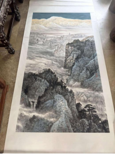 以水墨之灵韵,绘就雪山下公园城市的诗意长卷。用笔端取西岭雪山之巍峨,以淡赭、素白层层晕染,让雪峰在天际晕出金辉,尽展 “日照金山” 的神圣与壮美;复写巴蜀群山之苍劲,以浓墨枯笔皴擦岩崖,松涛云海间,尽显川山的雄奇深邃。更妙者,在于传统山水肌理中,巧妙融入现代都市的轮廓与桥梁,让摩天楼宇在云雾中若隐若现,既保留了水墨山水的空灵意境,又赋予其时代的烟火温度,恰是对 “雪山下的公园城市” 最生动的艺术诠释。作品打破传统山水与都市景观的边界,以笔为针、以墨为线,缝合起自然天工与人文造作,在氤氲水墨间,既见金山的圣洁,又见城郭的生机,于尺幅之间,铺陈出天府之国 “天人共生、古今同辉” 的宏大叙事。